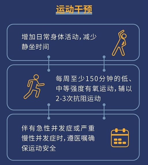 然后,要开展有氧运动、力量运动、平衡训练几种运动的结合。比如一位糖尿病患者,餐后血糖控制不好,我们一般不太主张餐前运动,建议进餐后45分钟到一个小时开始运动,运动20-30分钟,还要和用药、运动方式、饮食相平衡相配合。