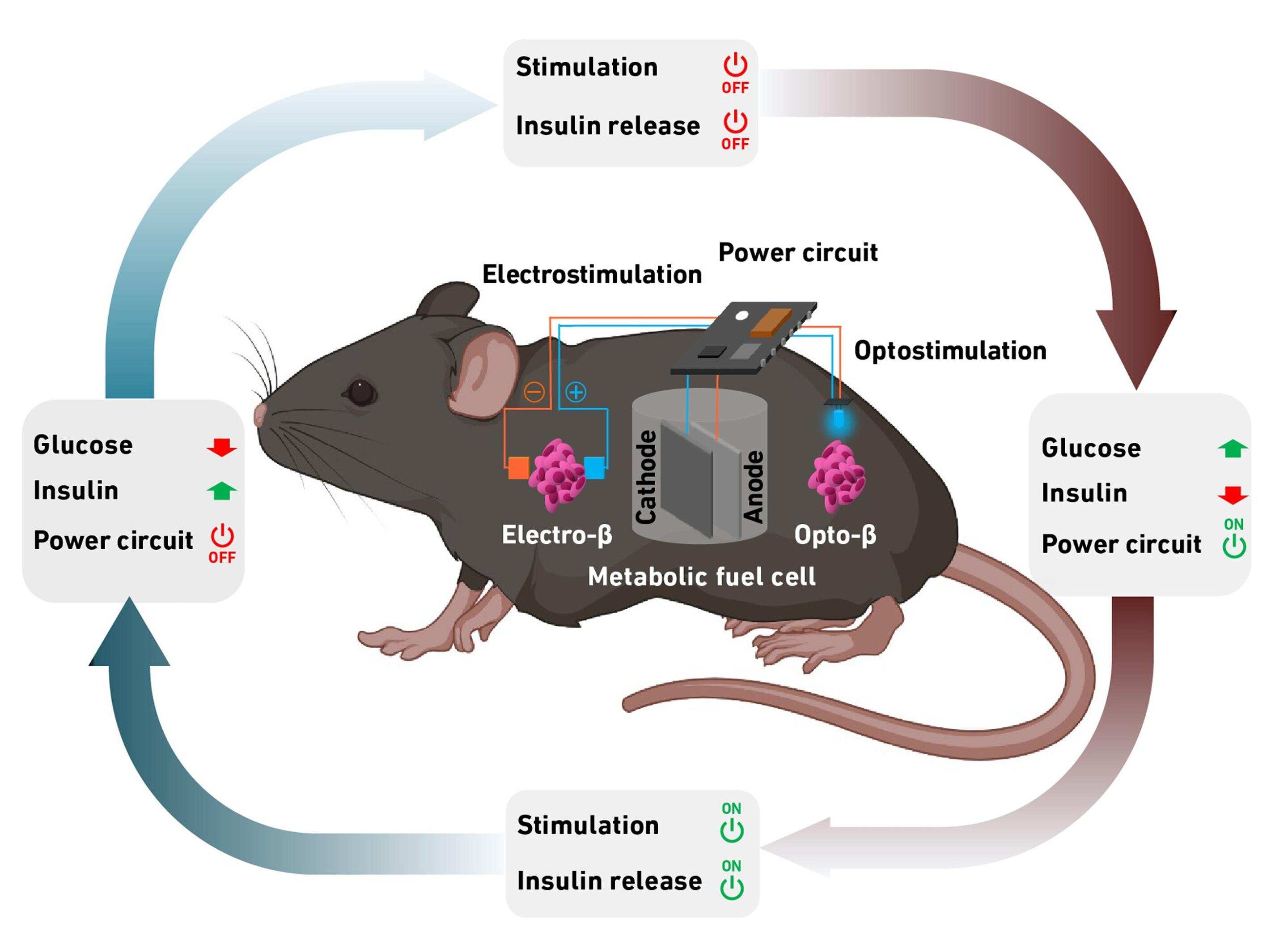 总的来说,这两个组件提供了一个自我调节的电路。当由葡萄糖驱动的燃料电池感应到过量的血糖时,它就会开机。然后,这将刺激β细胞产生和分泌胰岛素。当血糖水平下降时,它触发了燃料电池中的阈值传感器,所以它就会断电,反过来停止胰岛素的生产和释放。