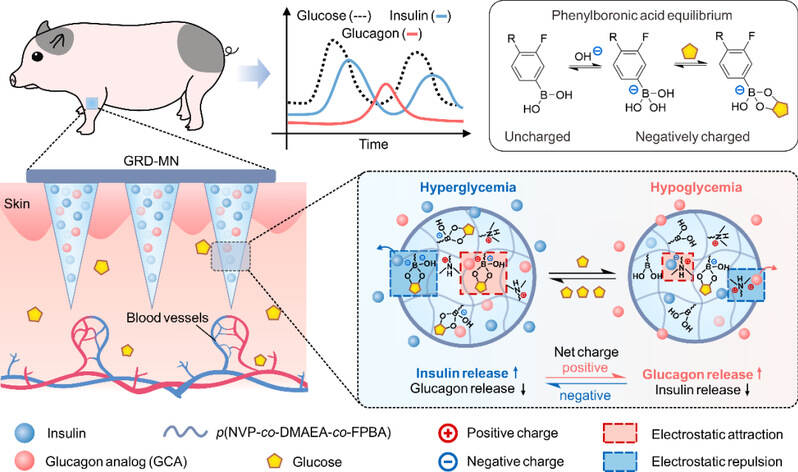通过将胰岛素和胰高血糖素共混载入高分子基的微针针体中,能够模拟胰腺中葡萄糖依赖性的胰岛素和胰高血糖素的分泌行为。