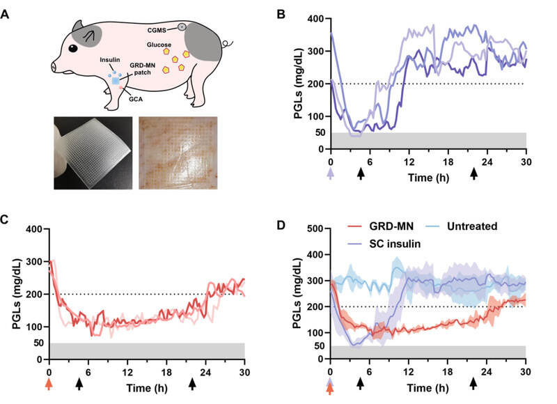 在1型糖尿病小鼠模型中的研究证实,GRD-MN贴片可以模拟胰腺功能,实现血糖的持续控制,并能有效预防胰岛素过量注射或延迟进食等极端情况下低血糖的发生。此外,在小猪模型中,该团队进一步验证了GRD-MN贴片在治疗糖尿病和预防低血糖等方面的有效性和安全性。