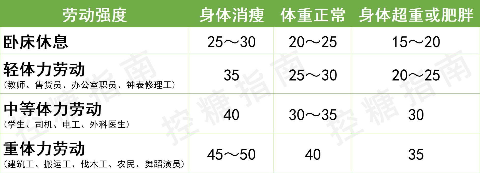 3、不同人群所需热量卡数(kcal/KG),此数值以患者日常劳动强度为参考,分为以下四型:
