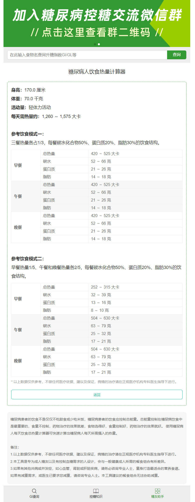 计算工具请在“控糖指南”官网“糖友助手”里找到“饮食热量计算器”,具体计算方法如下。